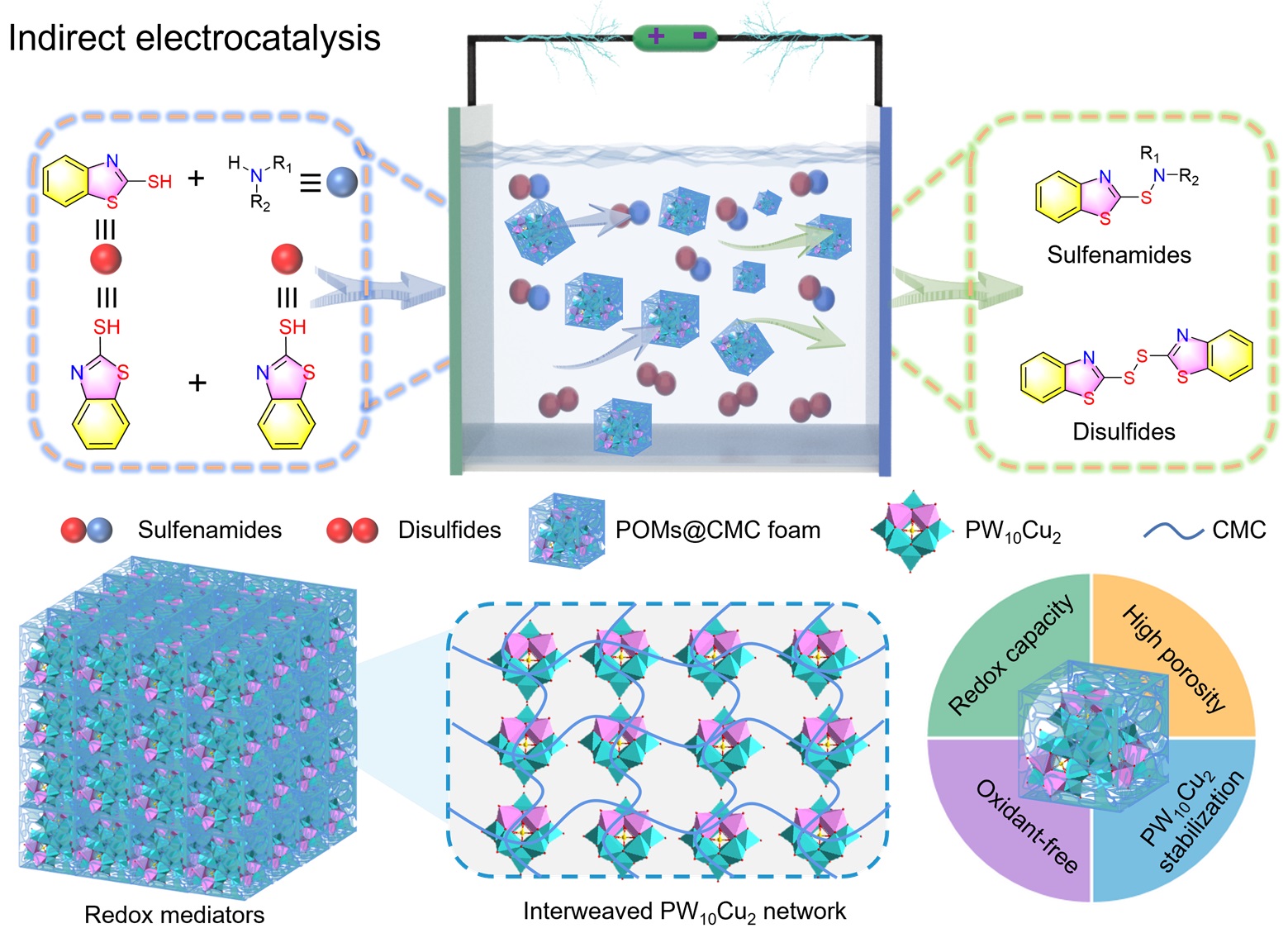图 多金属氧簇基泡沫材料间接电催化构建S-N/S-S键示意图