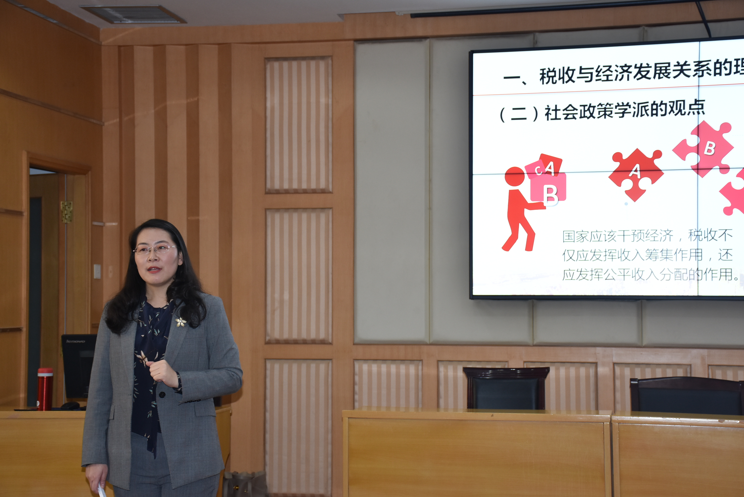 匡萍首先以山东省青年教师竞赛一等奖获奖课程—《税收与经济发展》为例,为大家展示了一节示范课。她以特朗普政府的减税计划导入本节课程,抛出“减税政策是美国经济繁荣的灵丹妙药吗”这一问题,然后系统讲授了税收与经济发展关系的三个学派的理论观点,重点介绍了供给学派的税收观点和拉弗曲线,引导学生用学到的知识思考中国应该如何应对全球减税法案的冲击,中国要如何继续实施减税降费举措。
