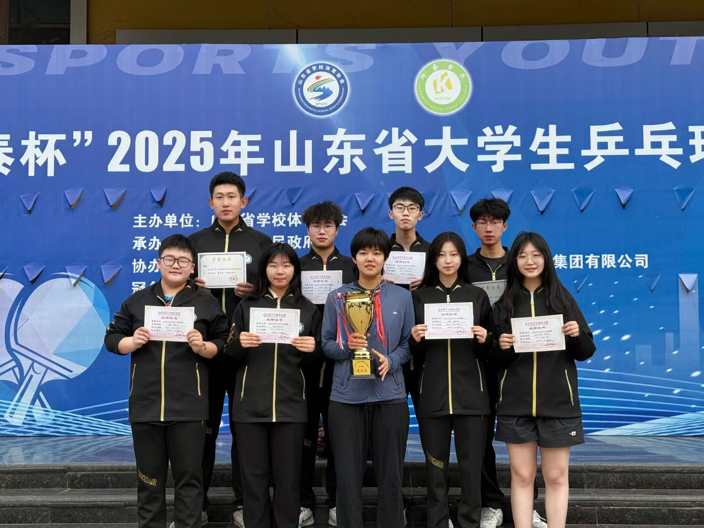 5月17日至23日,山东省大学生乒乓球锦标赛在临沂市临沭县举行。我校首次组建甲组(普通大学生组)队伍参赛,凭借拼搏精神与精湛球技,李淑环、车宜臻、王晓航取得了女子团体第六名、车宜臻获女子单打第六名、车宜臻和李淑环获女子双打第五名,团体总分三等奖的好成绩, 魏麟、车宜臻荣获“优秀运动员”称号。
