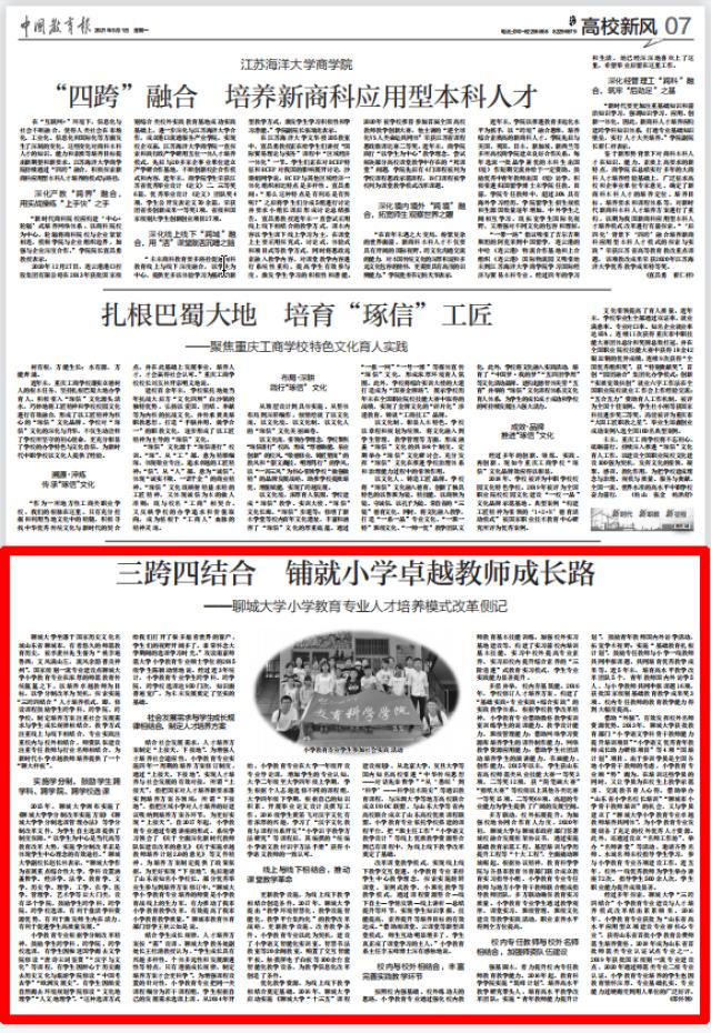 【编者按】3月1日,《中国教育报》第7版“高校新风”版面以《三跨四结合:铺就小学卓越教师成长路》为题,报道了我校教育科学学院小学教育专业人才培养模式改革的先进做法。
