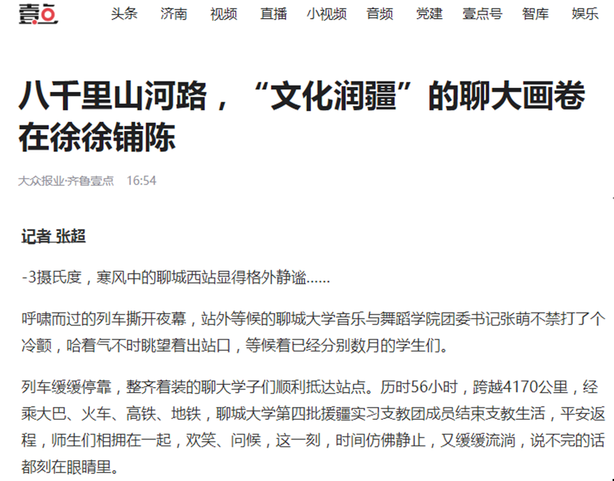 【编者按】1月22日,【齐鲁晚报•齐鲁壹点新闻客户端】以《八千里山河路,“文化润疆”的聊大画卷在徐徐铺陈》为题报道了yl23455永利第四批援疆实习支教团成员以出色的表现进行“文化润疆”的动人事迹。
