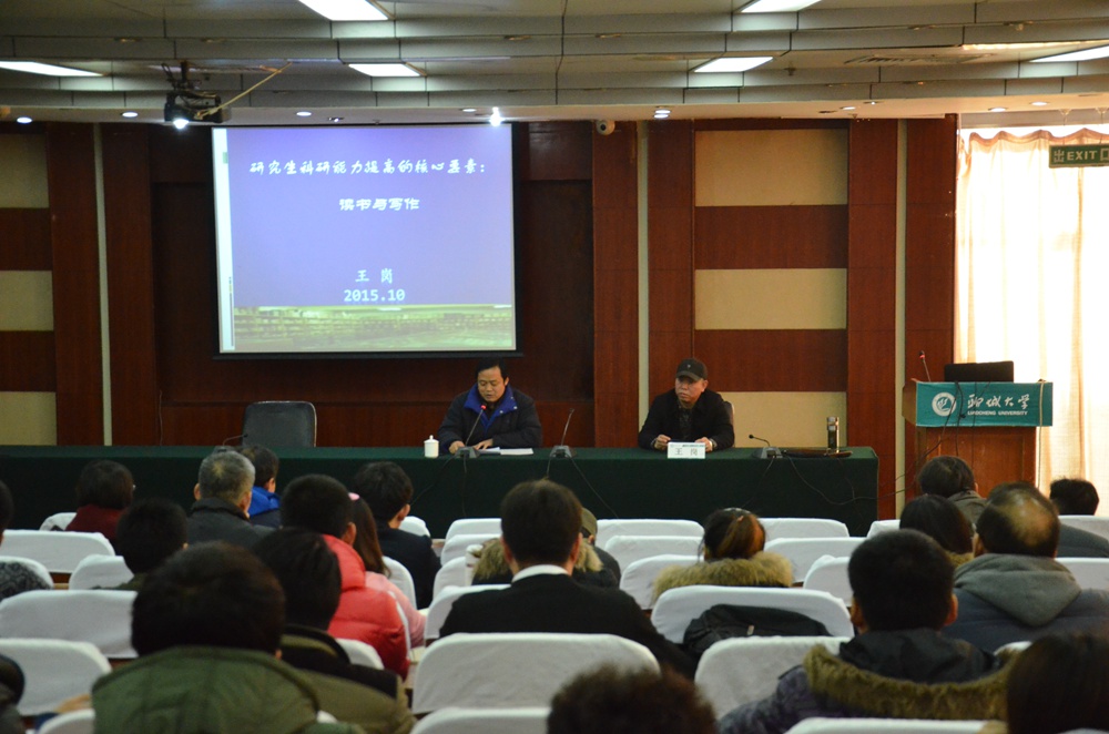 12月25日,武汉体育学院博士生导师王岗教授,应邀来我校东湖宾馆报告厅向体育学院研究生导师与学术骨干教师、研究生和部分本科生作题为“研究生科研能力提高的核心要素:读书与写作”的学术报告,体育学院副院长钟明宝教授主持会议。