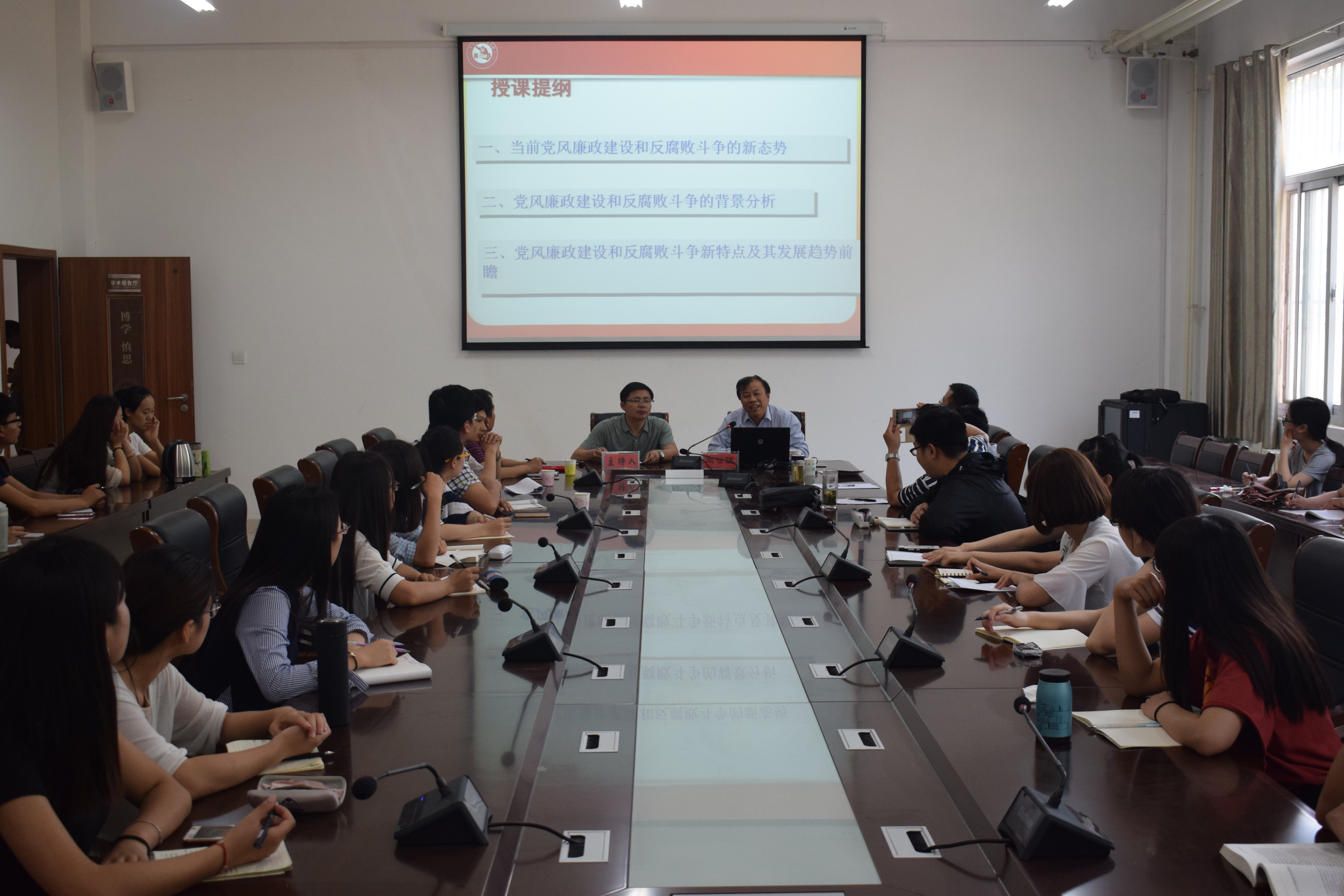 5月20日,应政管学院之邀,江苏省王世谊教授于政史楼c101学术报告厅作了以《当前反腐败斗争的新态势新特点及其发展趋势》为题的学术报告。报告会由院长助理于学强主持,yl23455永利廉政研究中心相关研究员及2015级行管专业学生与会聆听。
