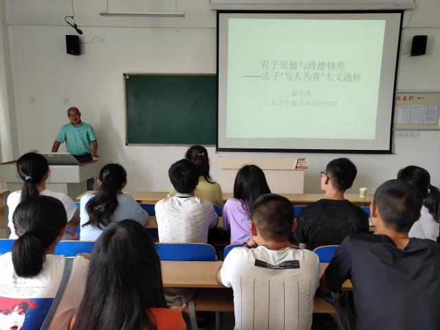 6月6日,由政管学院承办的聊大讲坛在东校区6#A204举行。山东大学儒学高等研究院的翟奎凤教授为师生们作了题为《君子至德与政德修养——孟子“与人为善”大义通释》的主题报告。报告会由政管学院院长唐明贵教授、哲学系延玥博士主持。