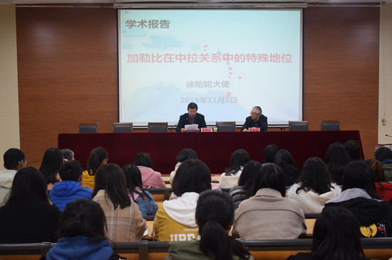 徐贻聪从研究拉丁美洲必要性为切入点,讲述了拉丁美洲的地理环境、区域划分、历史发展、语言、文字等方面的内容。他谈道,加勒比地区大多是小国家、发展中国家,但由于国家众多,成为联合国中一支重要的力量。中国非常重视与加勒比国家的外交关系,尤其是“一带一路”倡议提出后,加勒比地区国家积极响应,中国与加勒比地区国家互补性很强,也有着交往的愿望,先后已有8个国家与中国签订了“一带一路”合作协议。他还从一个外交家的角度对青年学子提出了谆谆教导,并鼓励学生积极为国家外交事业作出贡献。