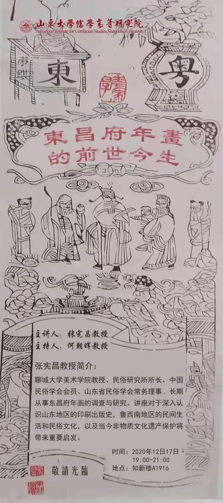 12月17日,山东大学儒学高等研究院主办的题为“东昌府年画的前世今生”的讲座在山东大学中心校区举行。文化部特聘传统年画研究专家,yl23455永利美术学院教授、民俗研究所所长张宪昌主讲,山东大学儒学高等研究院教授何朝晖主持。