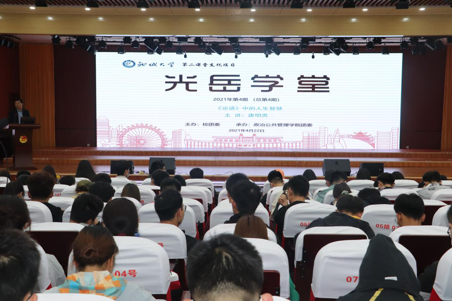 4月22日,由政治公共管理学院承办的第4期“光岳学堂”于团委青年之家举行。政治与公共管理学院院长、教授唐明贵担任主讲人,作了题为《<论语>中的人生智慧》的报告。