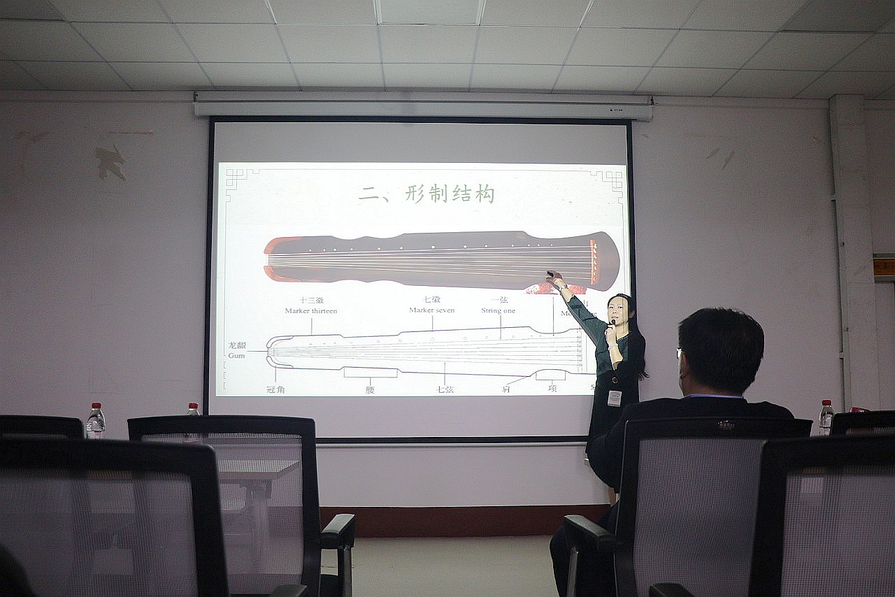 尹蕾通过图文与音视频结合的方式,从古琴的起源、构造、古今著名古琴演奏家和古琴独特的记谱法等方面介绍了古琴。她以古代典故孔子学音律为例,将琴谱与琴曲之间的关系讲解得生动有趣。通过赏析《阳关三叠》,引导大家领略古琴的独特魅力,品味“诗三百篇,孔子皆弦歌之”的风采。她说,在中国传统文化中,琴是一种地位崇高的乐器,迄今有近四千年历史,位列传统文化琴、棋、书、画“四艺”之首,被视为高尚情操和人格精神的象征。中华民族的优秀传统文化,承载着中华民族的智慧和传统美德,我们要从自己做起,保护传统文化,热爱传统文化,让更多人了解中国传统文化的精髓和文化价值和精神价值。