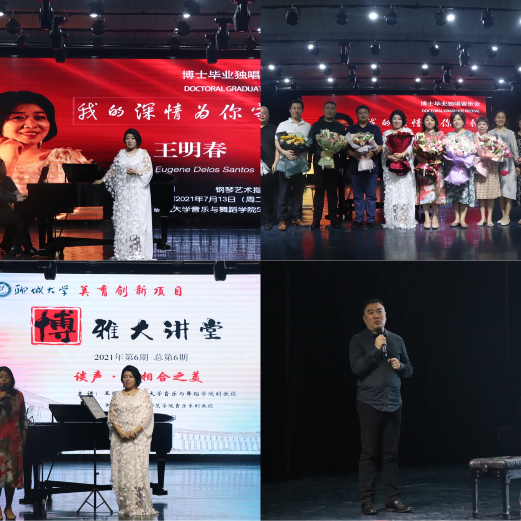 王明春演唱了《威尼斯赛船会》《欢腾喜悦》《夏夜》三首部声乐套曲,两首咏叹调《月亮颂》《你也知道他好妈妈》和一首中国作品《我的深情为你守候》。刘源从钢琴伴奏角度以歌曲《我的深情为你守候》为例,讲解示范如何从作品风格的把握、音乐意境的渲染、作品层次的处理等层面准确表达音乐,并展示这首歌曲在“声”与“乐”方面的合作细节,说明了不同体裁声乐作品演唱中,声乐与钢琴伴奏的相合之美。