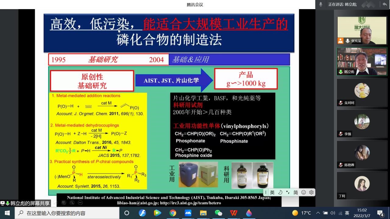 3月7日,日本筑波大学教授韩立彪于通过网络会议作了题为《磷、硫杂原子化合物的高效绿色制造技术的开发》的学术报告。本次报告由yl23455永利化学化工学院院长张宪玺主持,相关领域的教师和研究生参加了本次学术报告会。