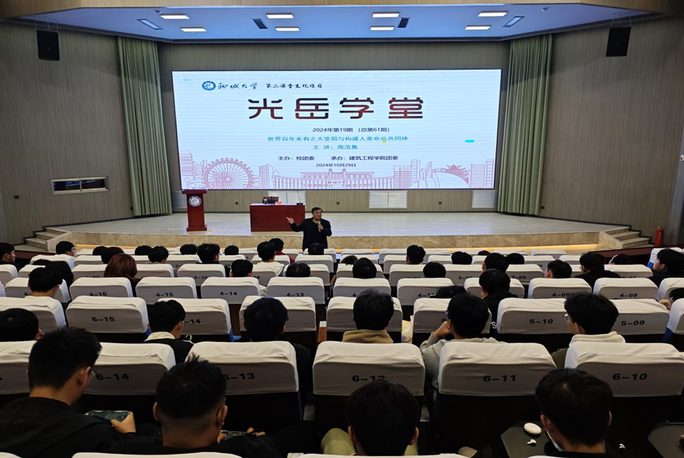 10月29日,由校团委主办、建筑工程学院团委承办的第61期光岳学堂于东校区实训楼报告厅举行。马克思主义学院教授周浩集受邀担任主讲人,作题为《世界百年未有之大变局与构建人类命运共同体》的讲座。建筑工程学院200余名学生聆听讲座。