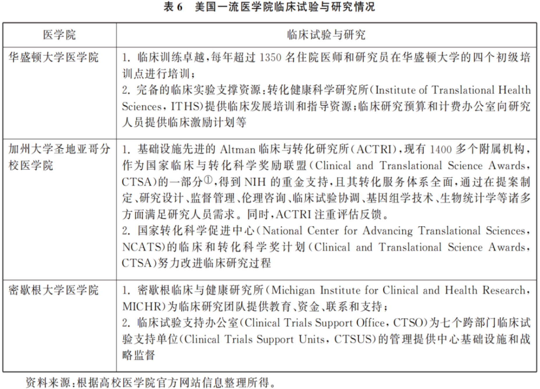 美国一流医学院注重临床试验与转化研究。临床试验旨在测试一种新疗法或新药物的安全性和有效性,是科学研究从工作台到病床的关键步骤。美国医学院每年参与大量的临床实验,在全方位的服务体系与高效的管理系统支撑下,通过医疗体系与研究中心的彼此协调,积极发现治疗疾病的新技术和新方法(见表6)。中国临床研究效率与国际先进国家和地区相比存在差距和不足。蒋立新等发表于《柳叶刀》的研究表明,若以每百万人均研究数目计算,中国临床注册研究低于南非、日本、巴西、俄罗斯等国。